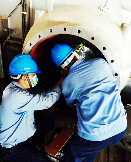 此次检修的是进口多轴机组,结构与国产机组略有不同,需要拆卸的管道、蜗壳、仪表等小部件众多,仅拆卸机组就需要检修人员花费极大地耐心和更长的时间。凭借多年的工作经验,项目经理李军合理安排拆卸顺序,并要求大家将每一个拆下的零部件都仔细做好标识并包装归放整齐,避免遗失影响回装工作。在他的带领下,团队成员有条不紊的开展各自工作,仅用了一天时间,就完成了机组拆卸工作,他们的专业和高效给急于恢复生产的用户吃下了定心丸。